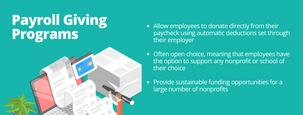 Payroll giving allows employees to donate directly from their paycheck using automatic deductions set through their employer. Often, these programs are open choice programs, meaning that employees have the option to support any nonprofit or school of their choice through their payroll giving program. As a result, these programs provide sustainable funding opportunities for a large number of nonprofits.
